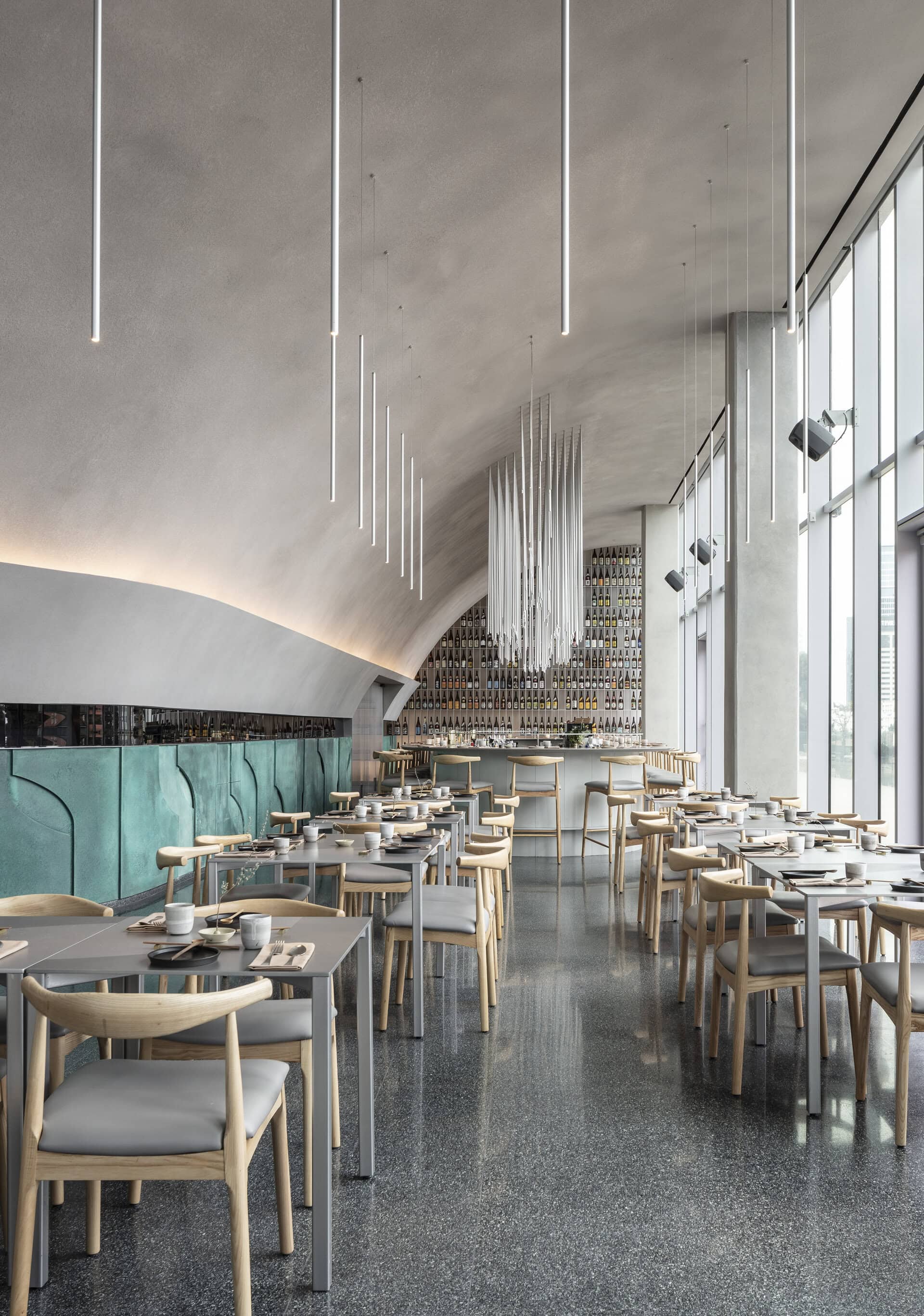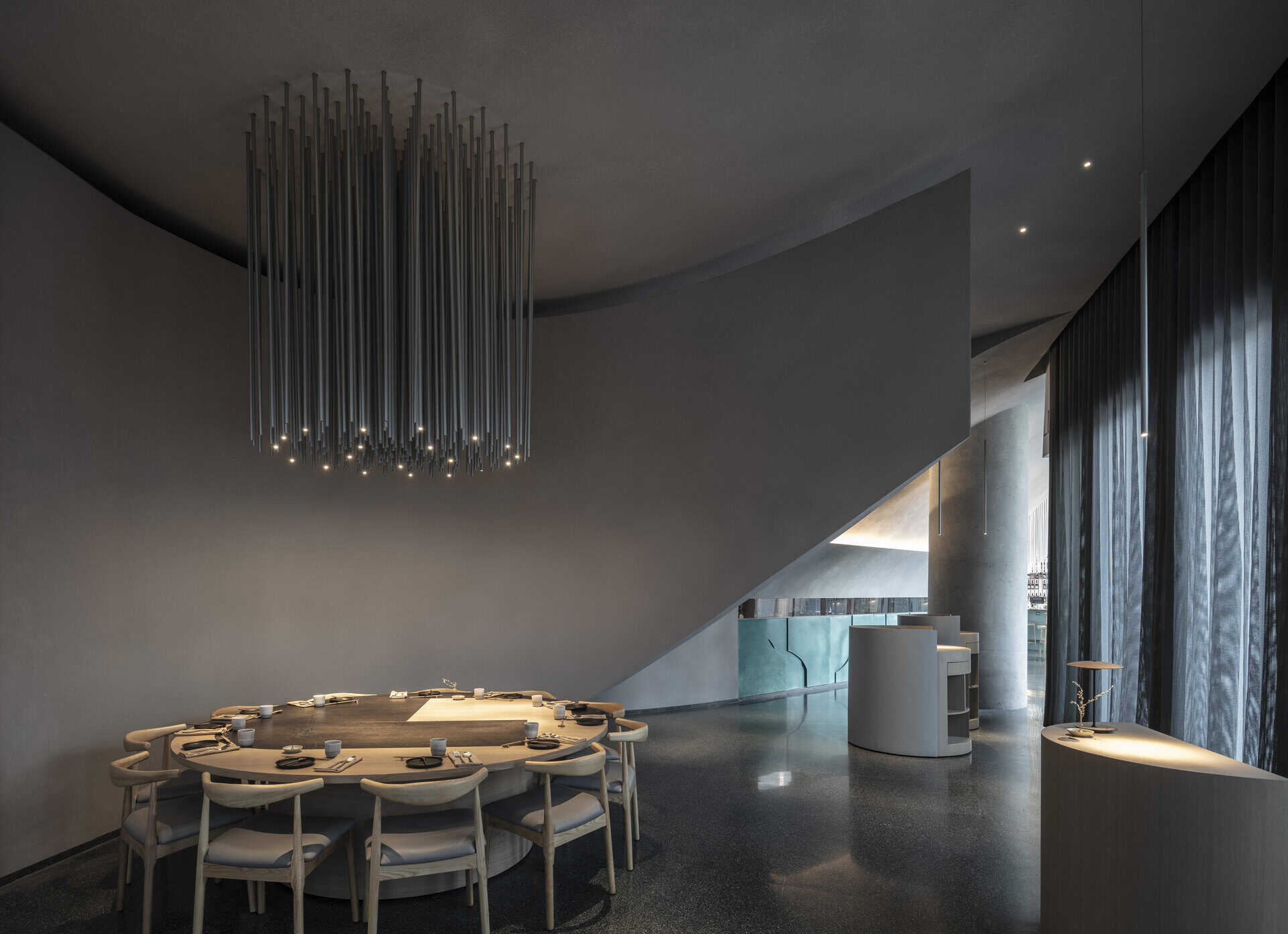 The space is essentially monochromatic in shades of light warm grey and draws its inspiration from modern Japanese architecture that is sculpted in concrete. The copper patina and wood of the dining chairs endow the space with accents of color, and the terrazzo grey floor introduces sprinkle of green and recalls European materiality while also referencing local Israeli heritage.
