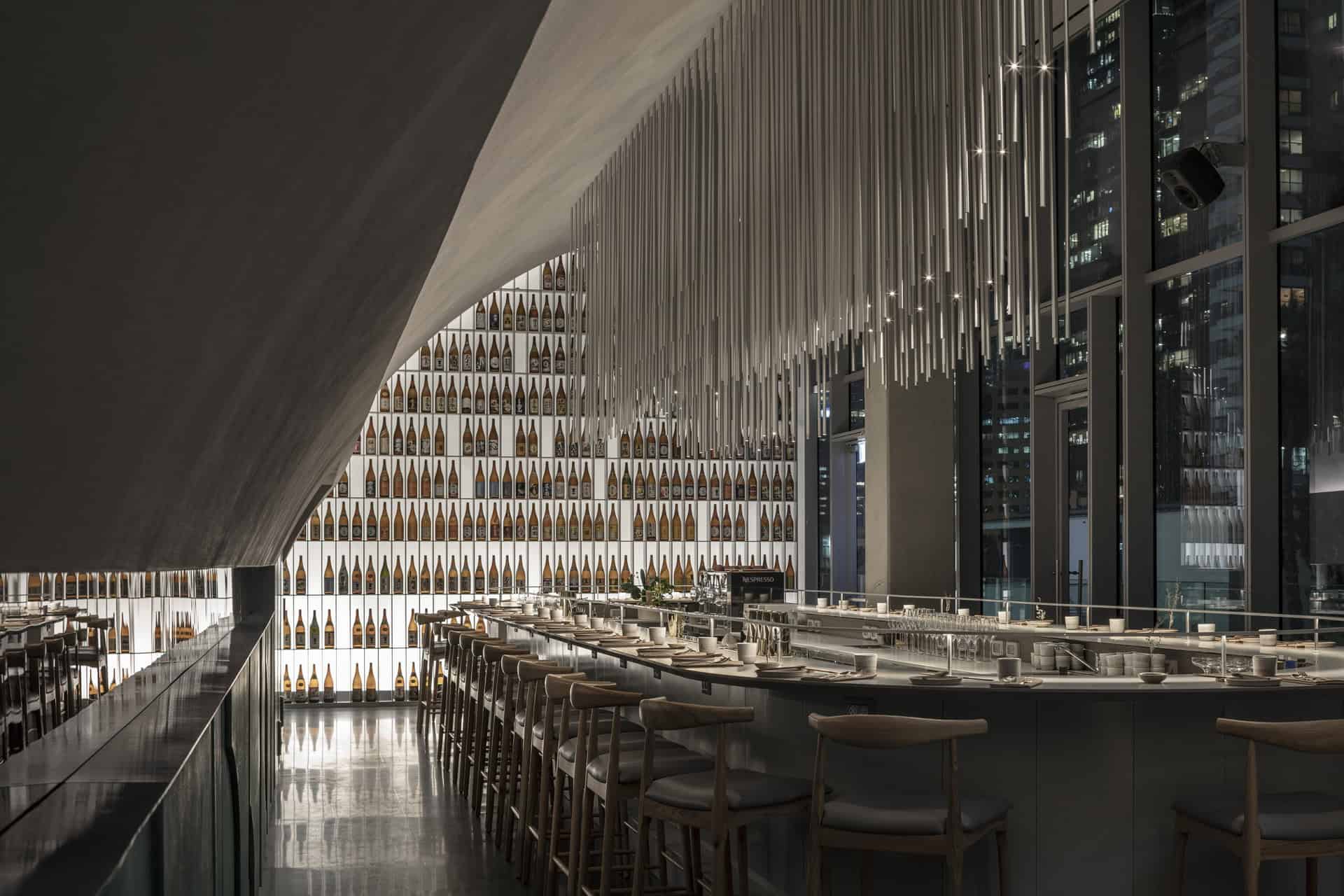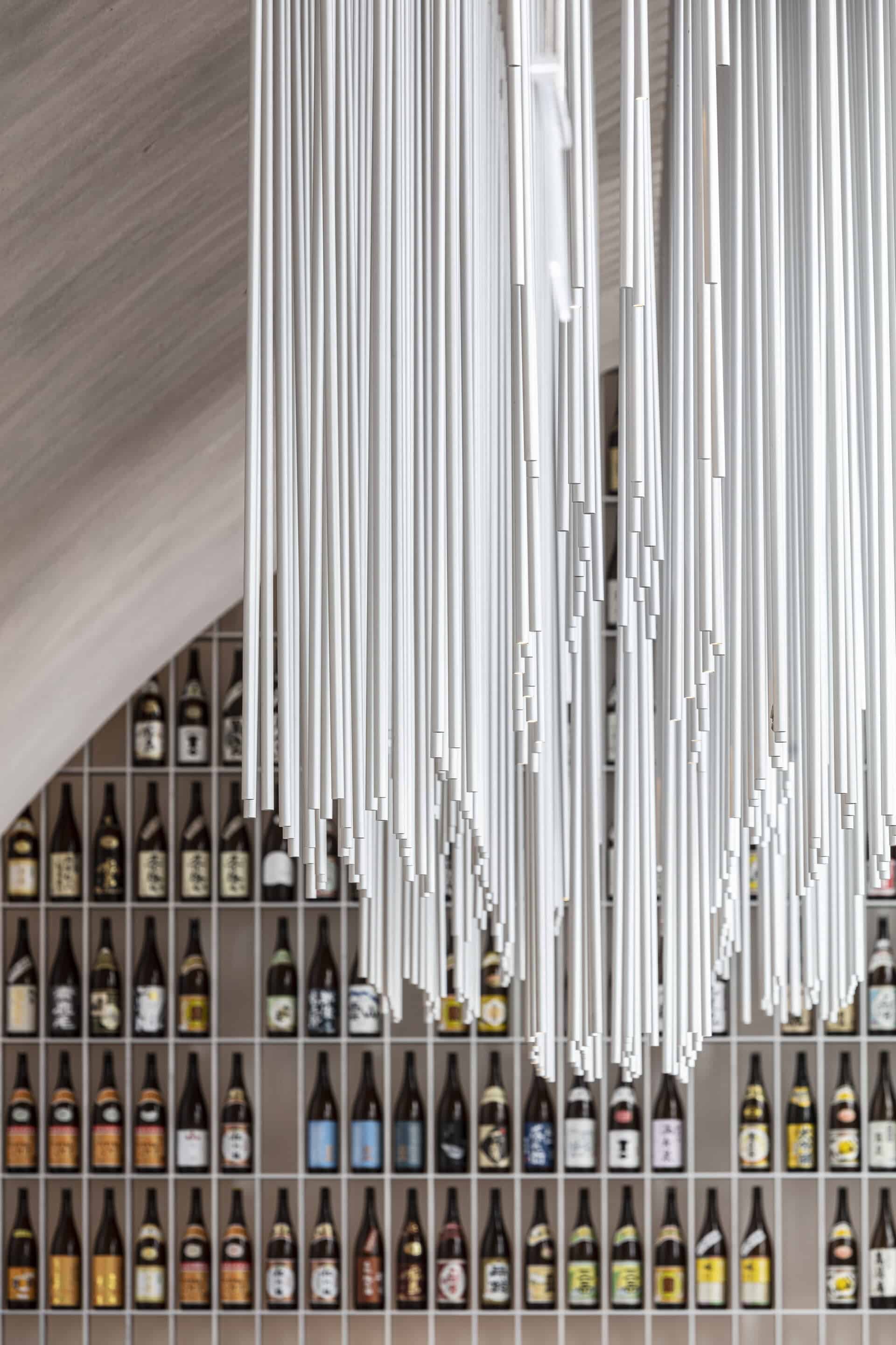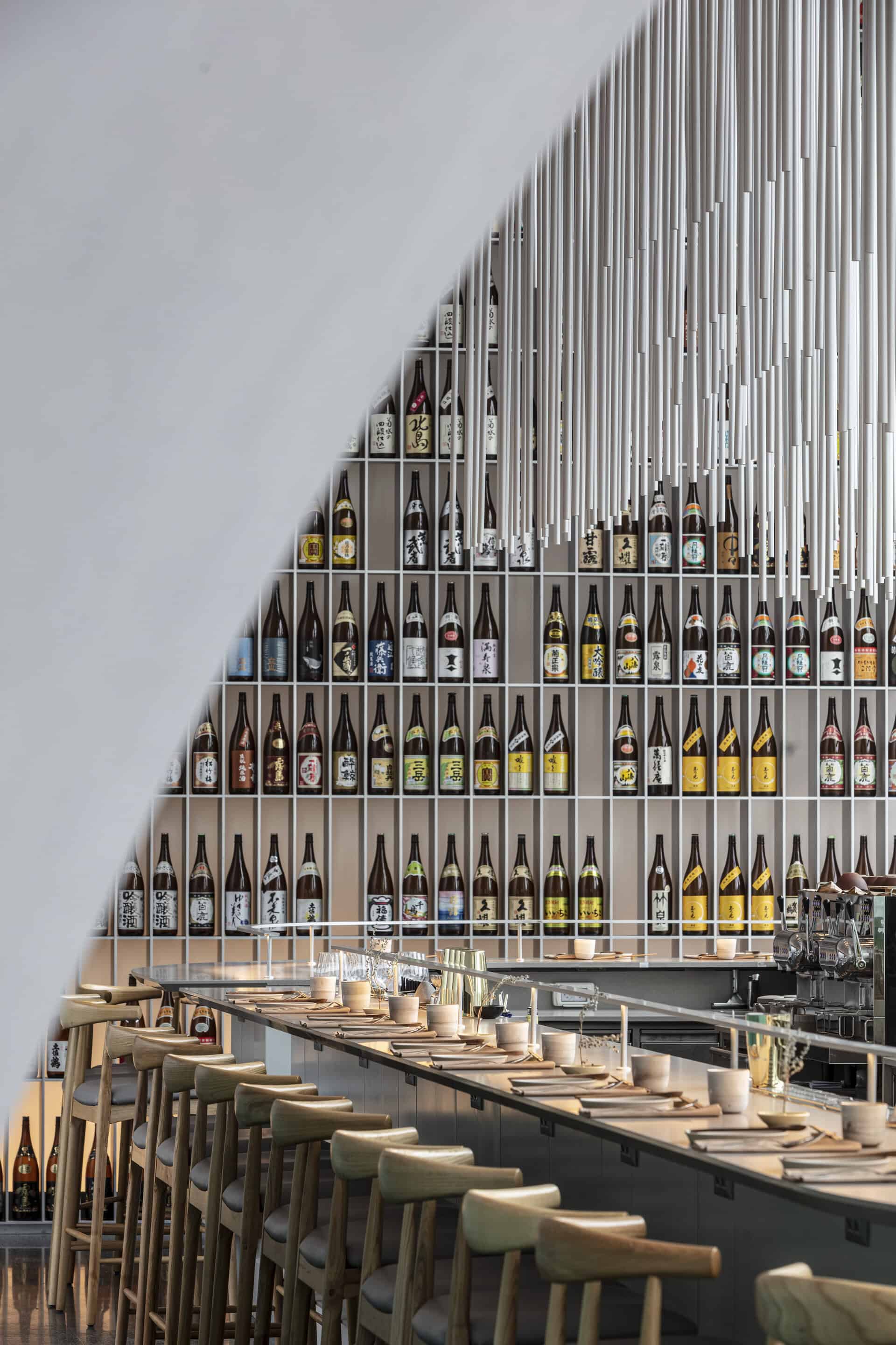The end of the architectural view culminates in the sake display library, constructed of brushed aluminum which defines the end of the space and functions as the backdrop of the restaurant’s central bar.