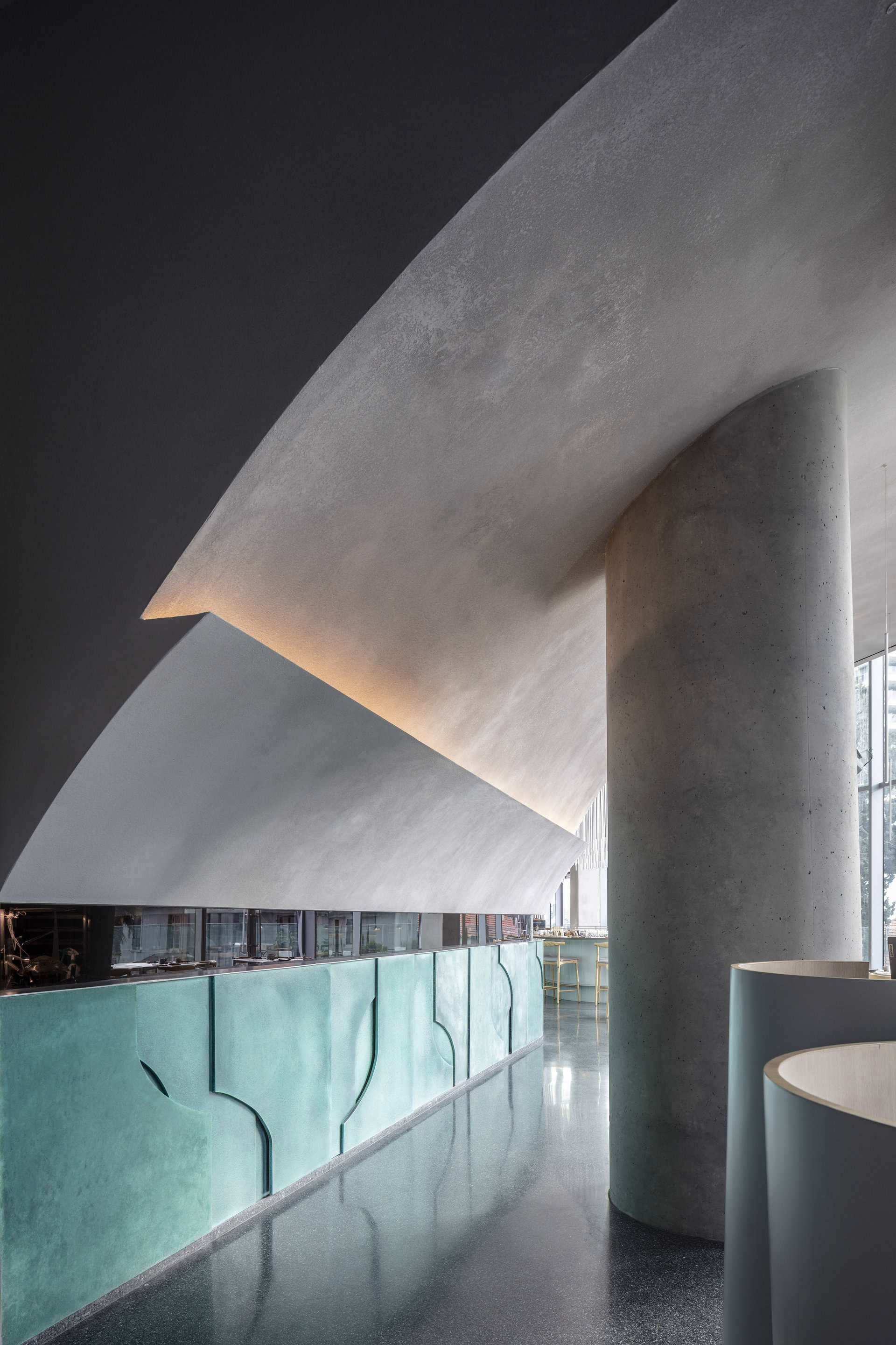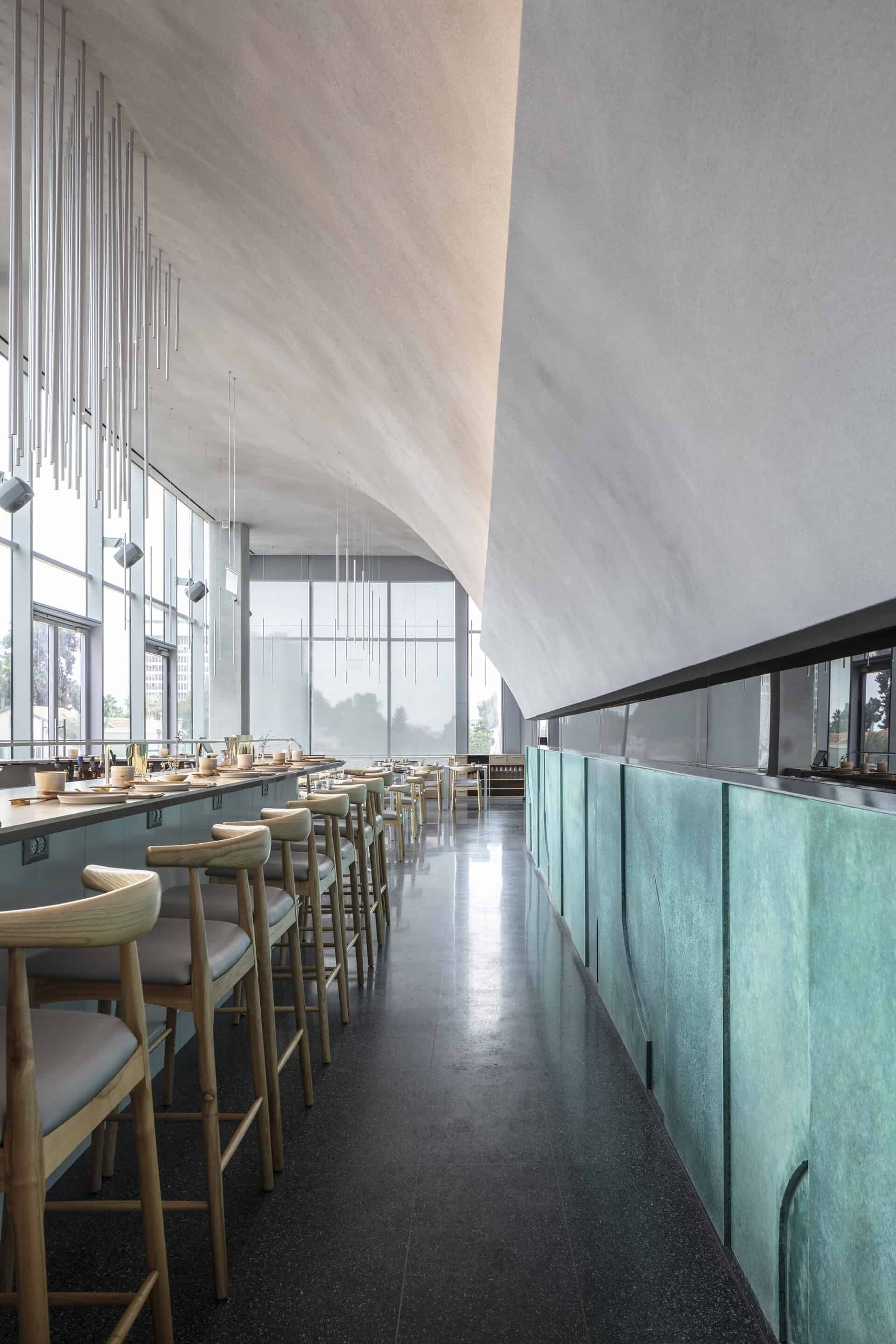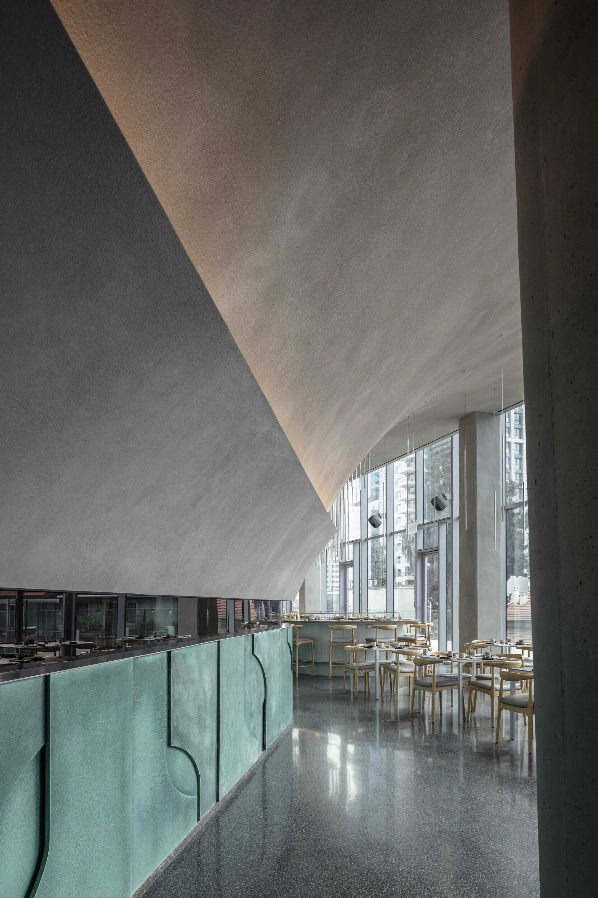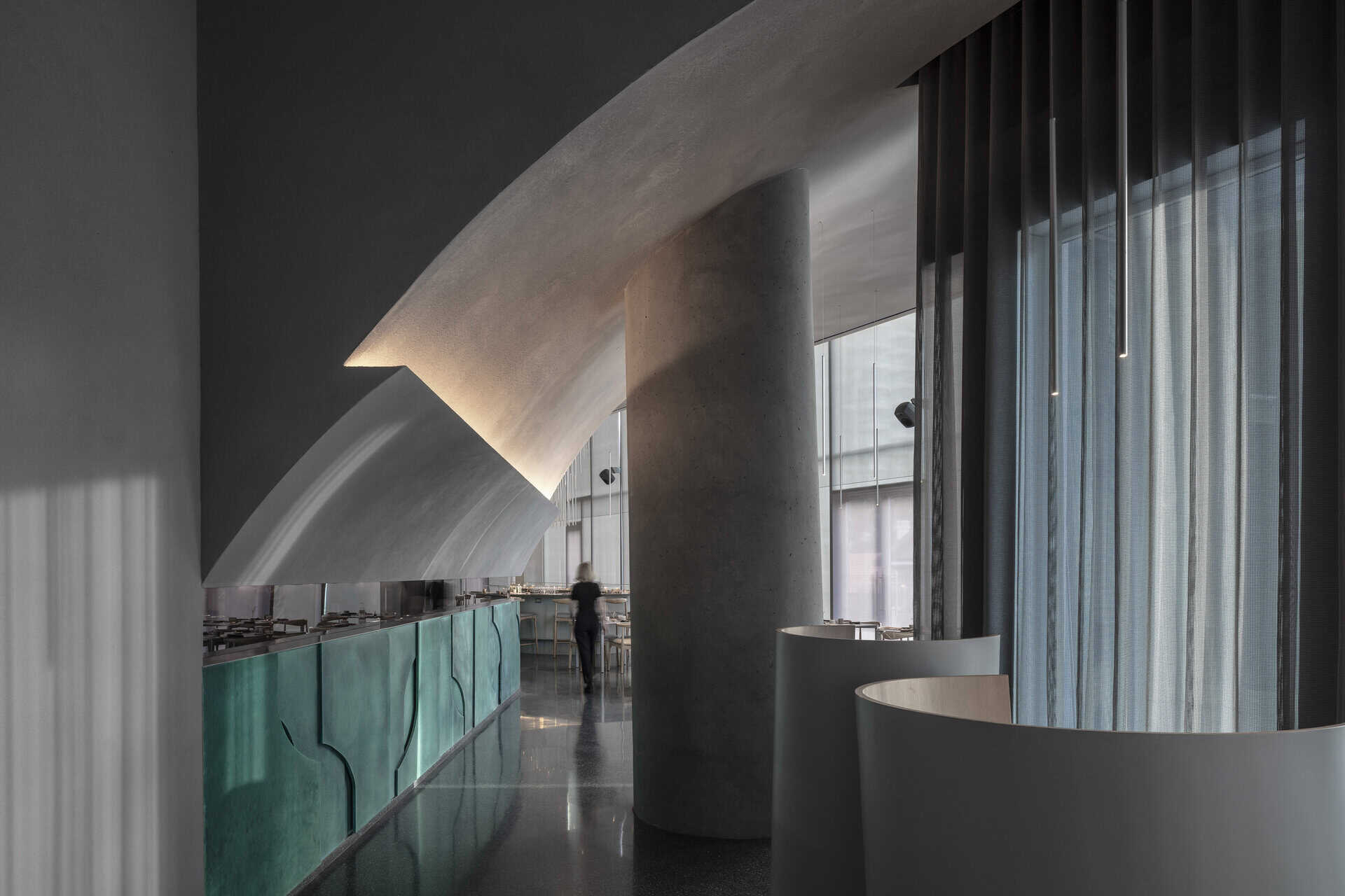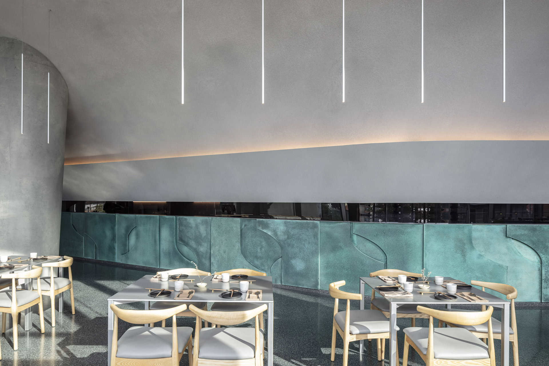 This main partition that defined the dining hall is horizontally divided in three, where each part fulfils a different role: A graphic composition in the language of the half-arch realized in turquoise copper patina cladding embellishes the base of the partition. The patina recalls classic domed edifices and sculptures adorning western cities and elegantly expressing the passage of time. Above this base stretches a long narrow window exposing the industrious activity and the creative culinary force beyond the wall. Above this middle layer the halved-arch juts out to define the experience from above.