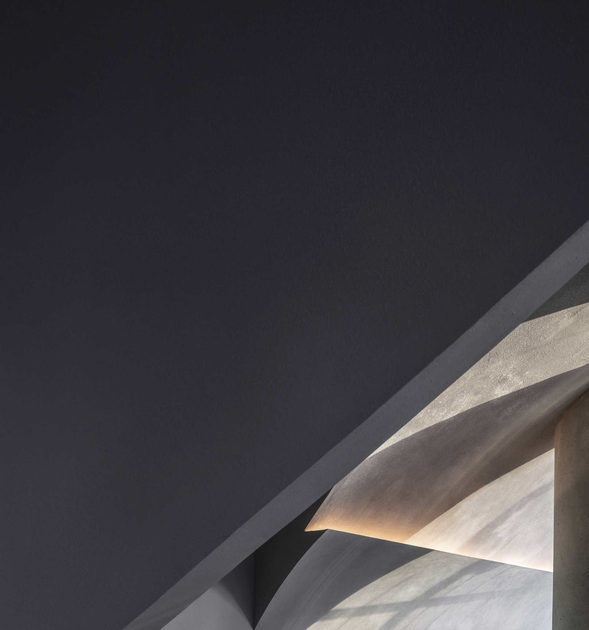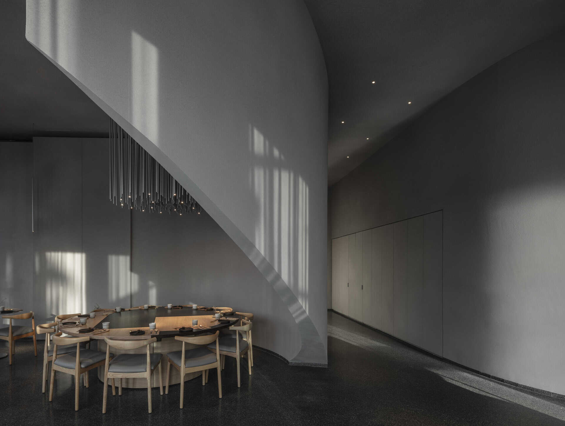 The curving wall is joined by a straight perpendicular wall and together the two lead the guests inwards to be met by the host. At this point the curving wall is detached from the ground and turns to encircle the private seating space, while the visitor is directed to the main dining space, where the view opens and the totality of the architectural gesture is revealed in its fullest.