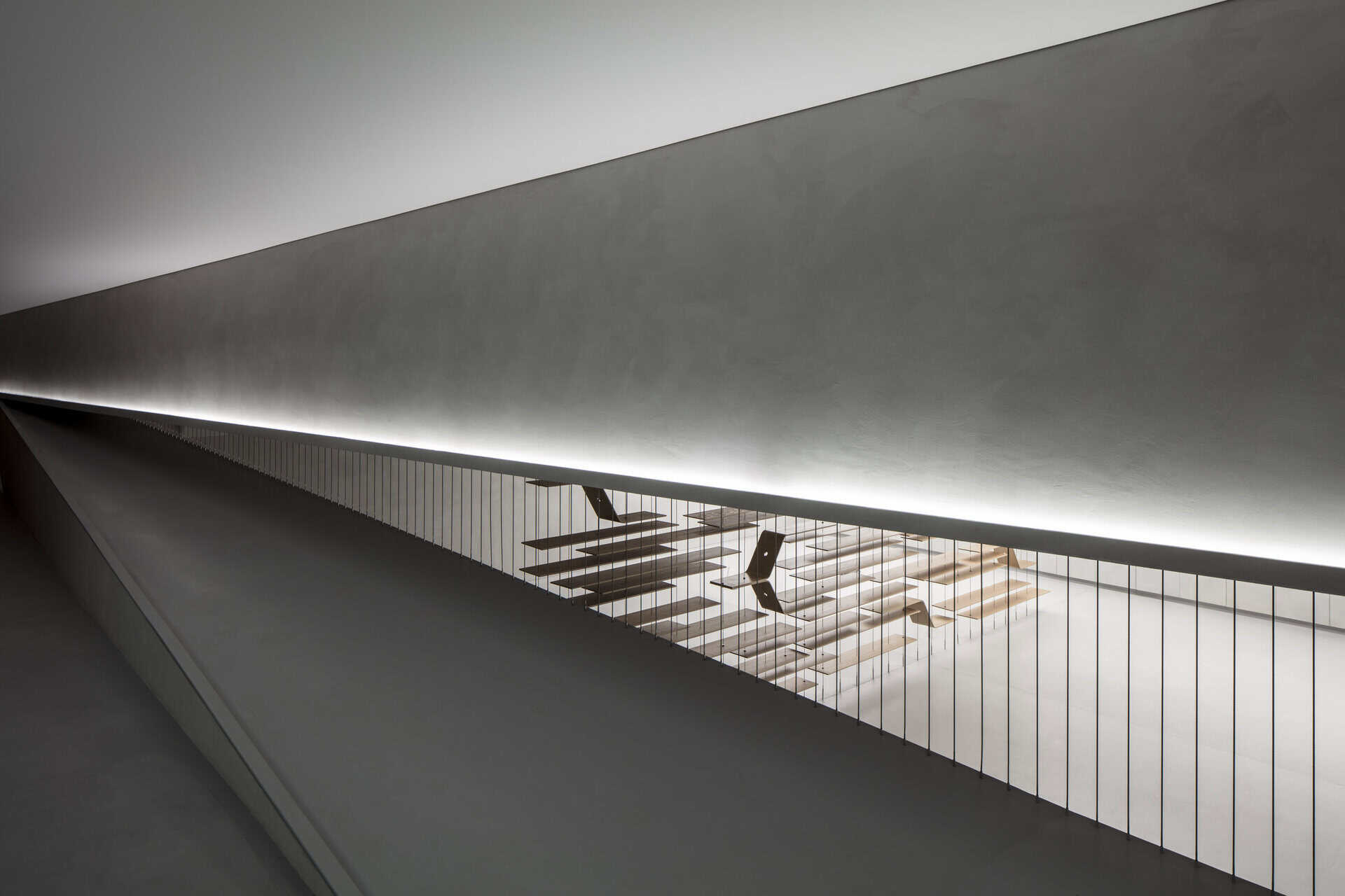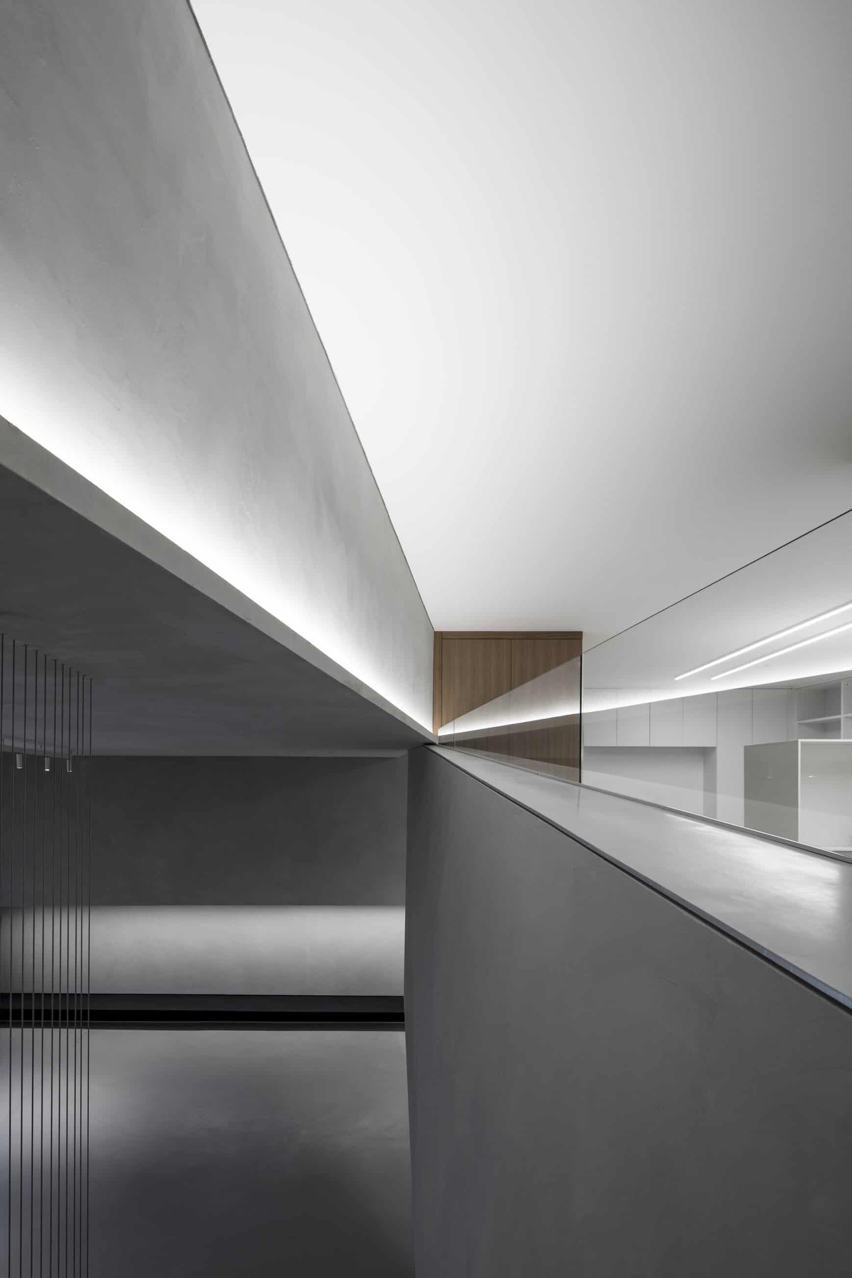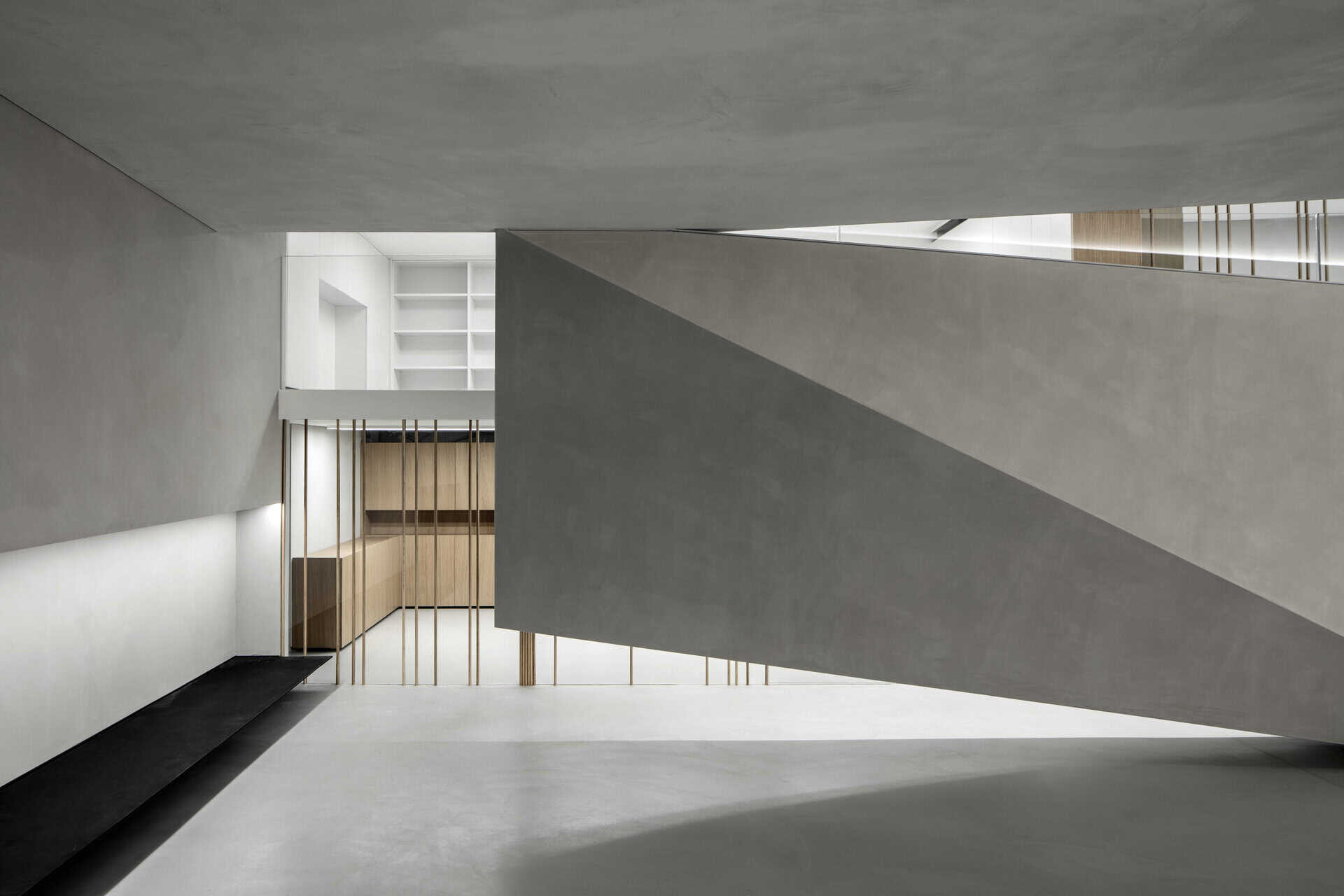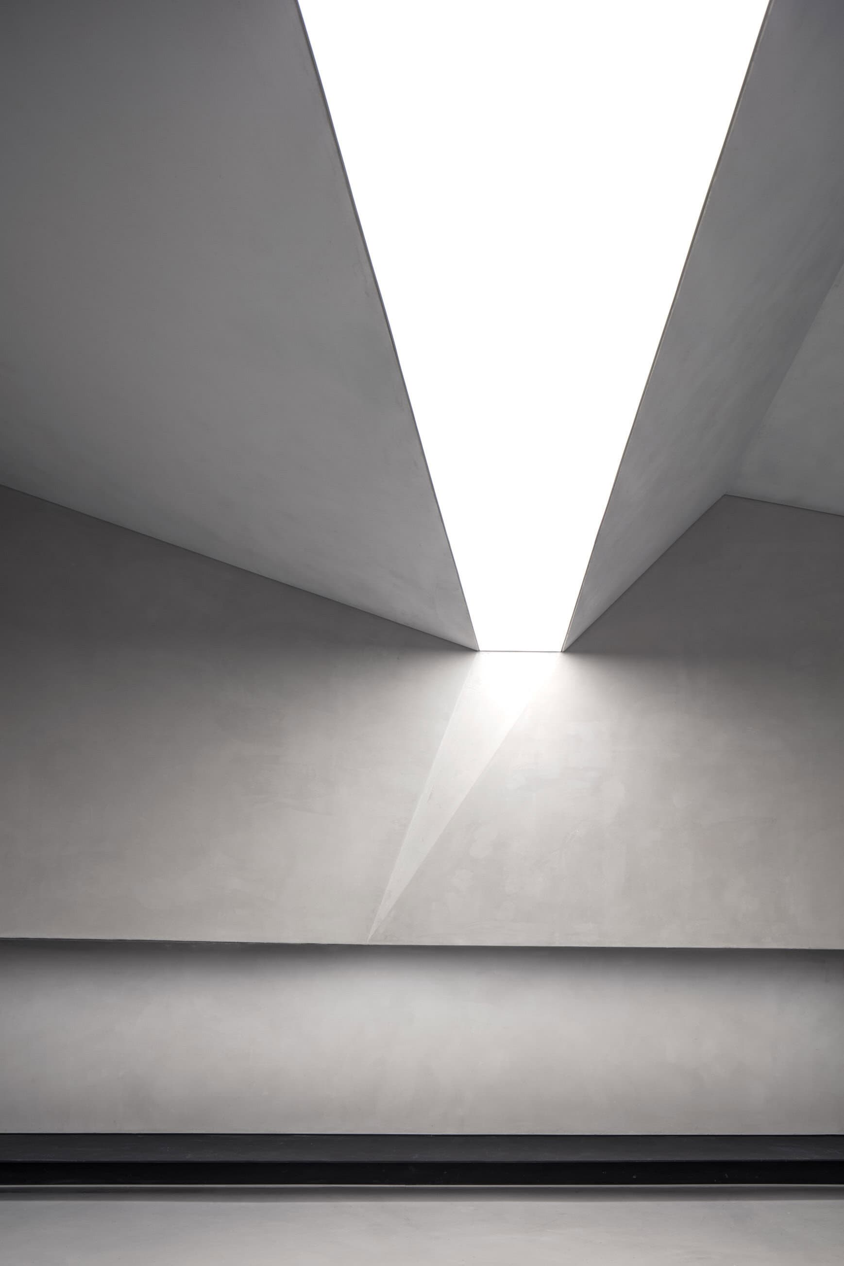 The architecture is sculpted of monochromatic plains that vary in angles and shapes. As the space in its entirety is made of grey cement micro-topping, and completely closed-off  from the outside, the boundaries between floor wall and ceiling dissolve. One of the ceiling plains acts as an artificial skylight, stretching all along the main space, drawing one to enter, leave the exterior world outside and embrace the unexpected experience.