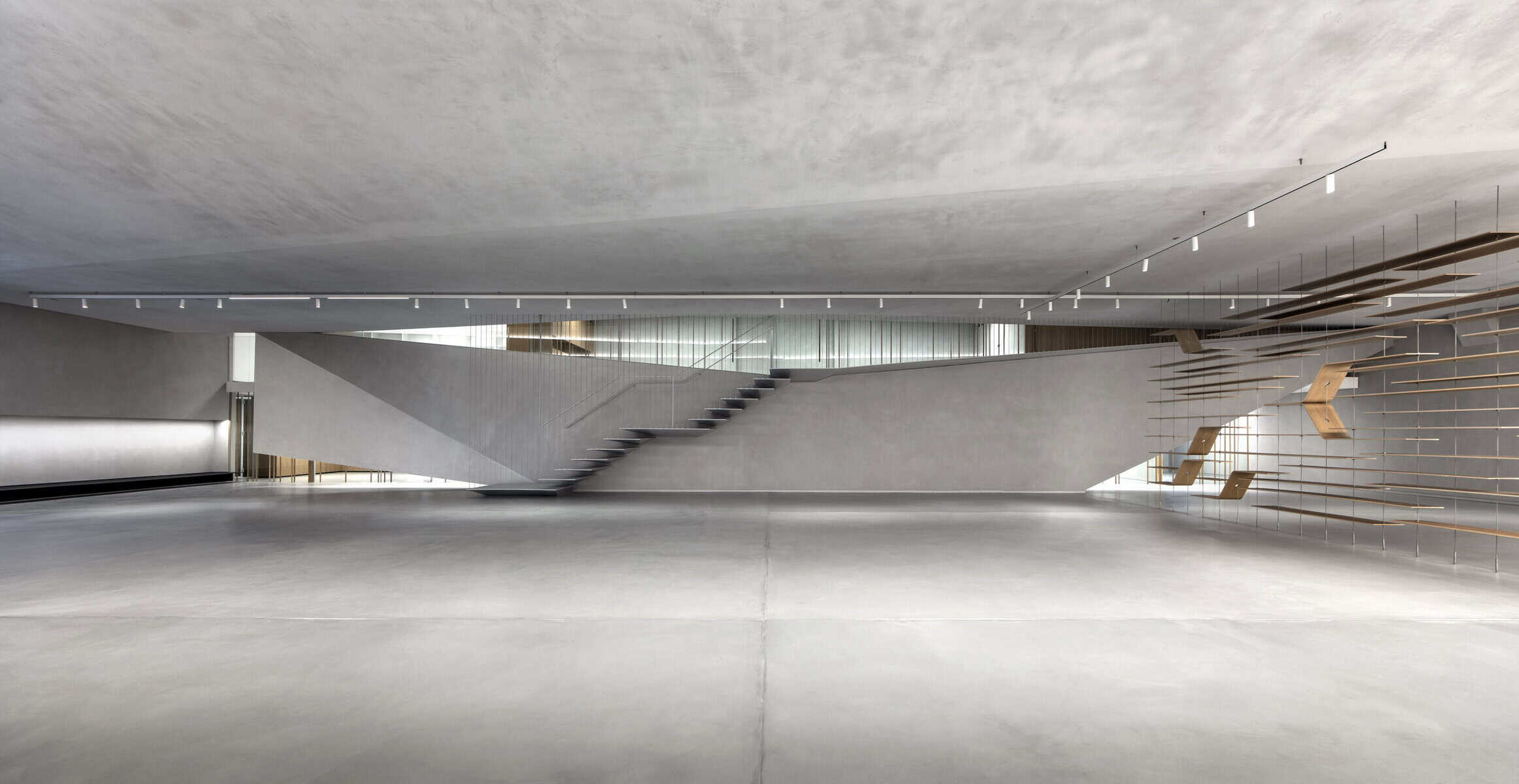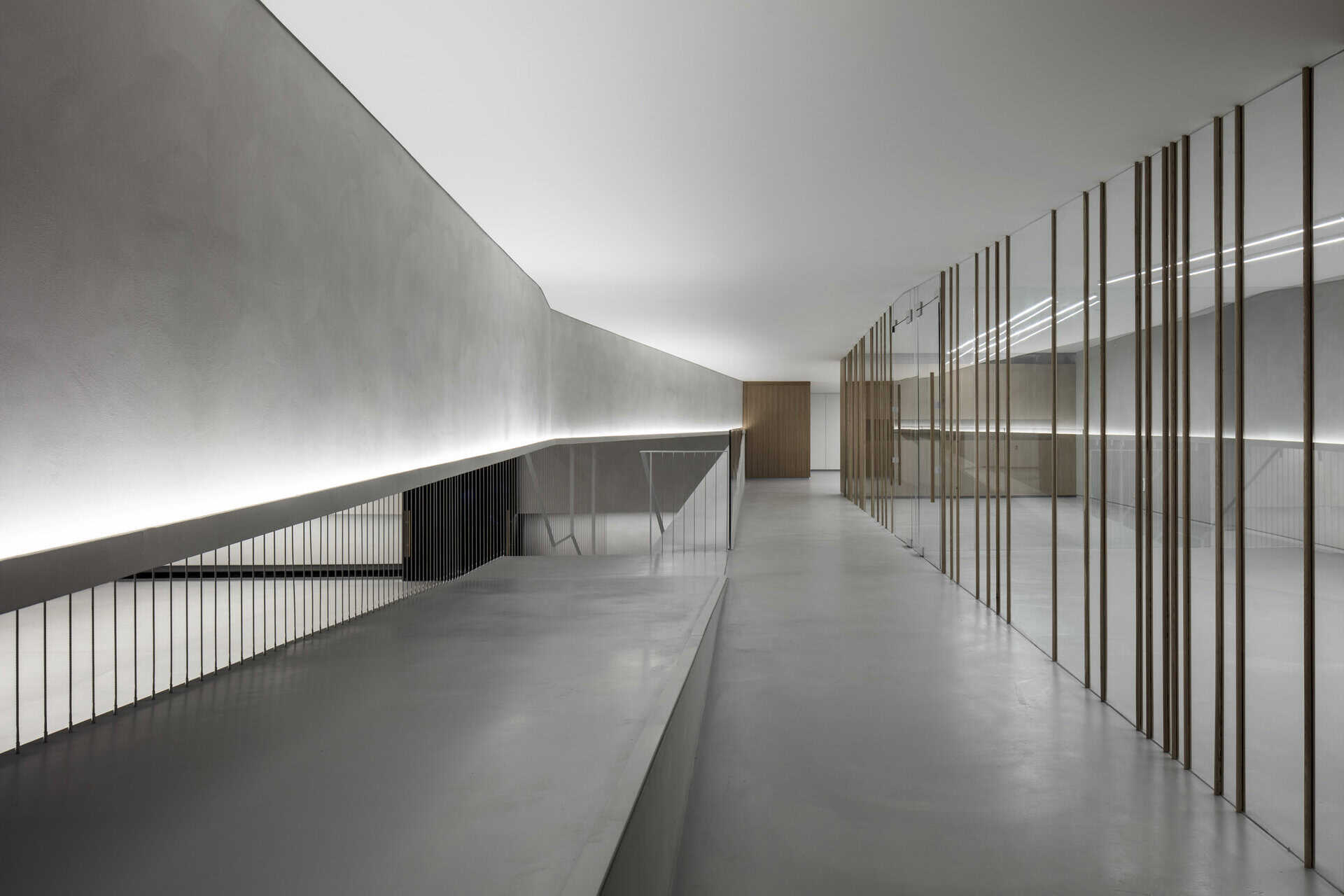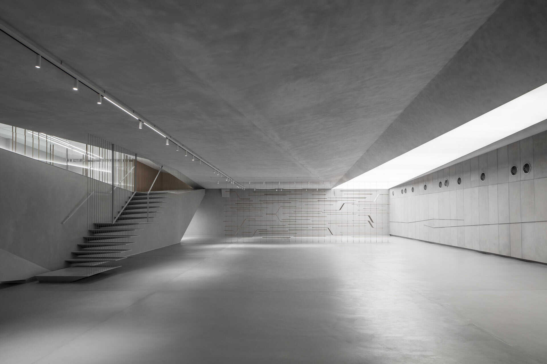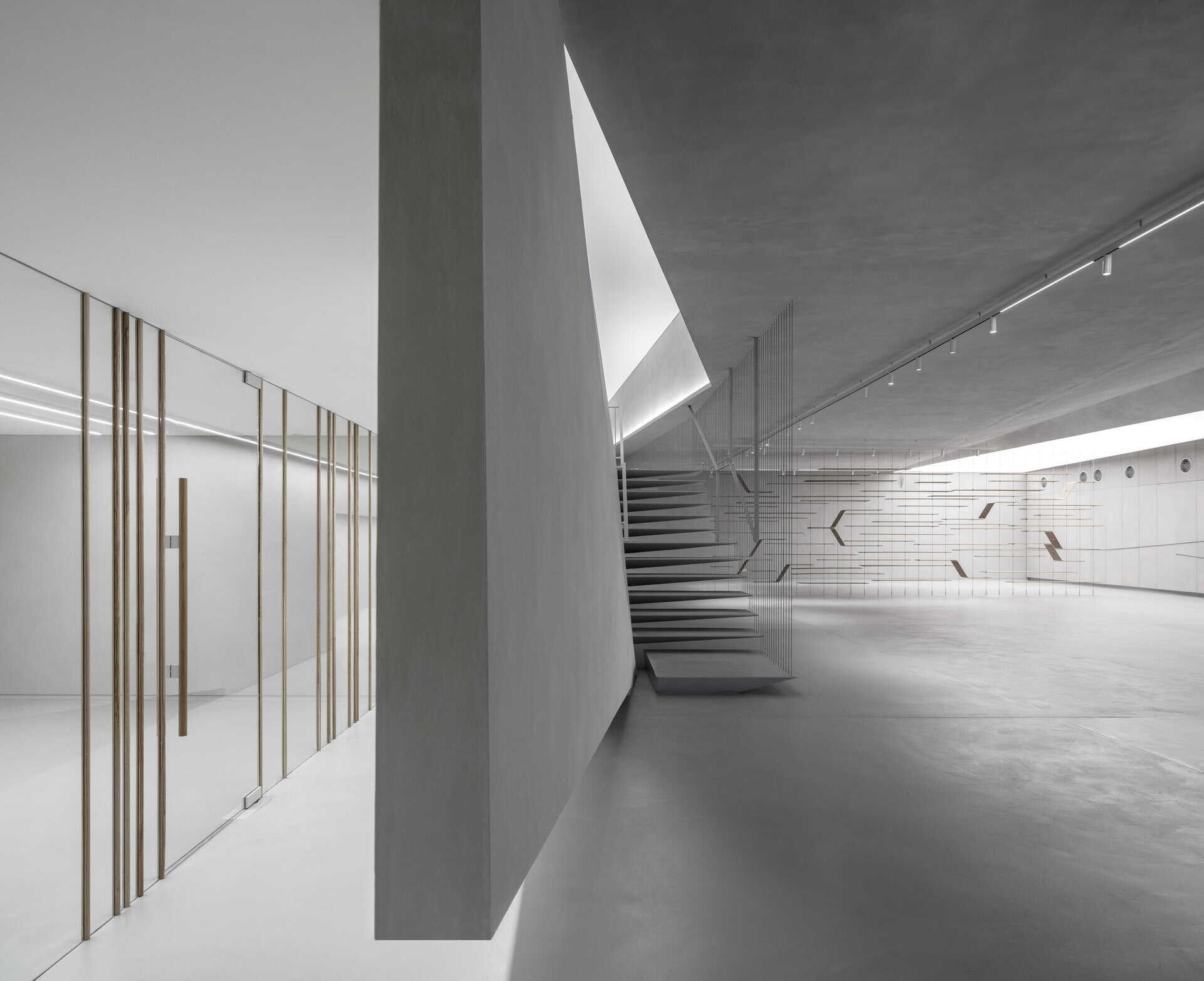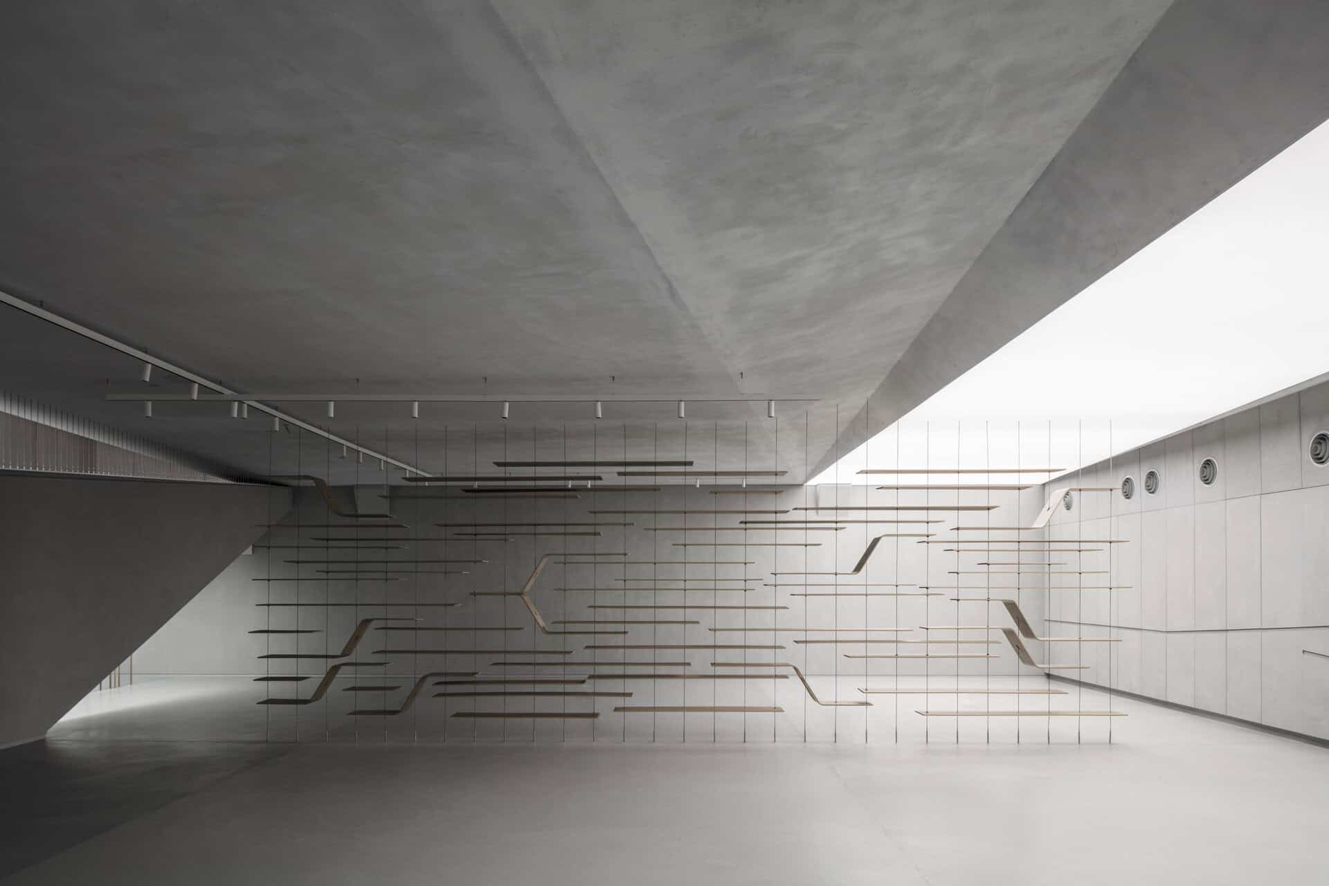 The architecture is sculpted of monochromatic plains that vary in angles and shapes. As the space in its entirety is made of grey cement micro-topping, and completely closed-off  from the outside, the boundaries between floor wall and ceiling dissolve. One of the ceiling plains acts as an artificial skylight, stretching all along the main space, drawing one to enter, leave the exterior world outside and embrace the unexpected experience.