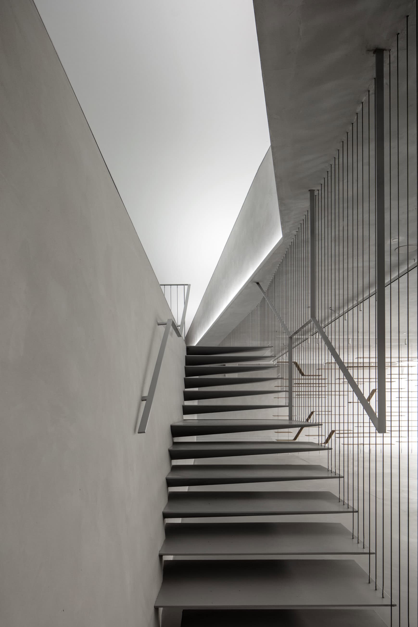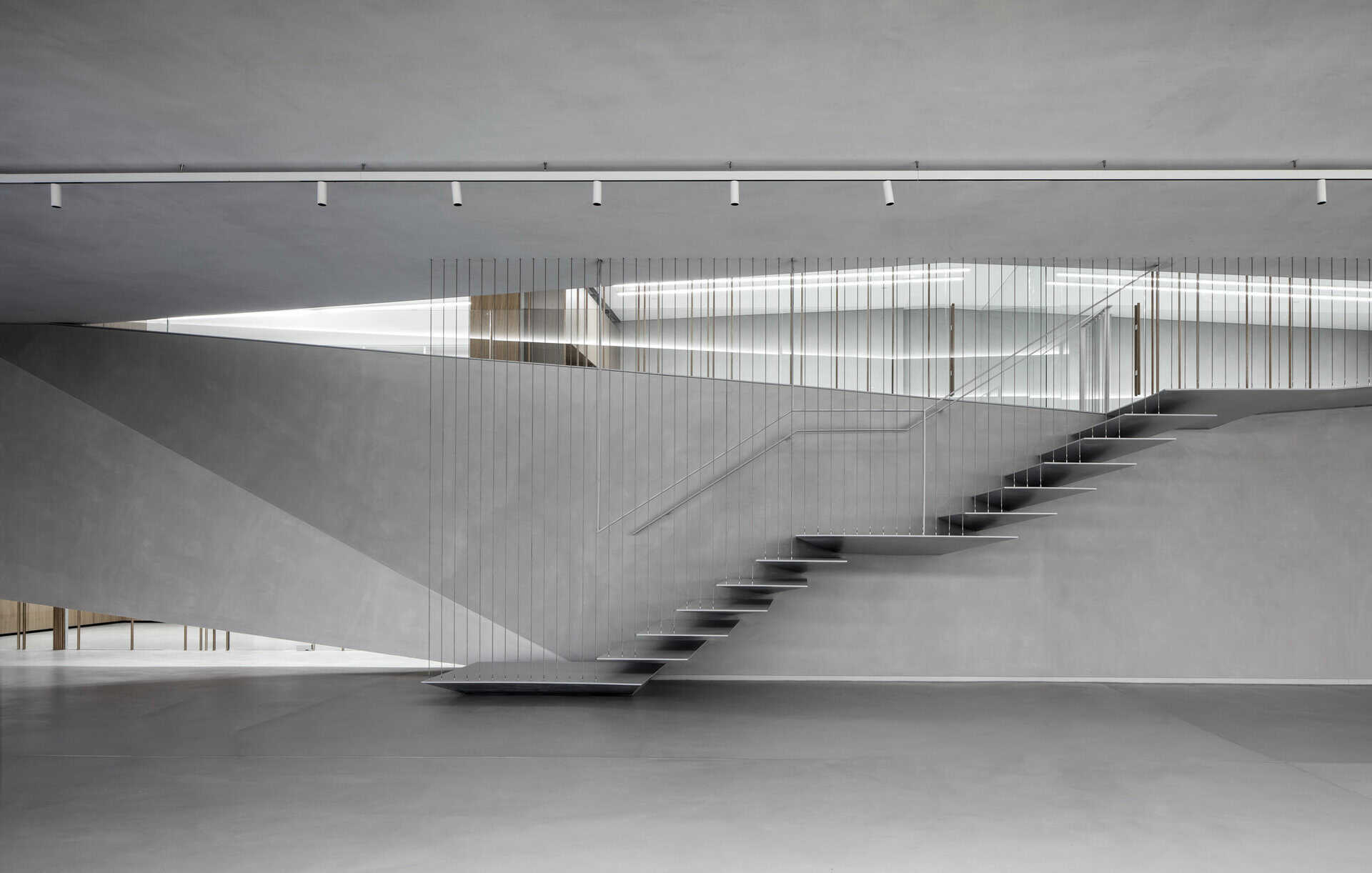 The large sculpted partition, separating the private offices from the showroom carries the cantilevered stairway to the mezzanine level, from which a beautiful framed view of the showroom is exposed.