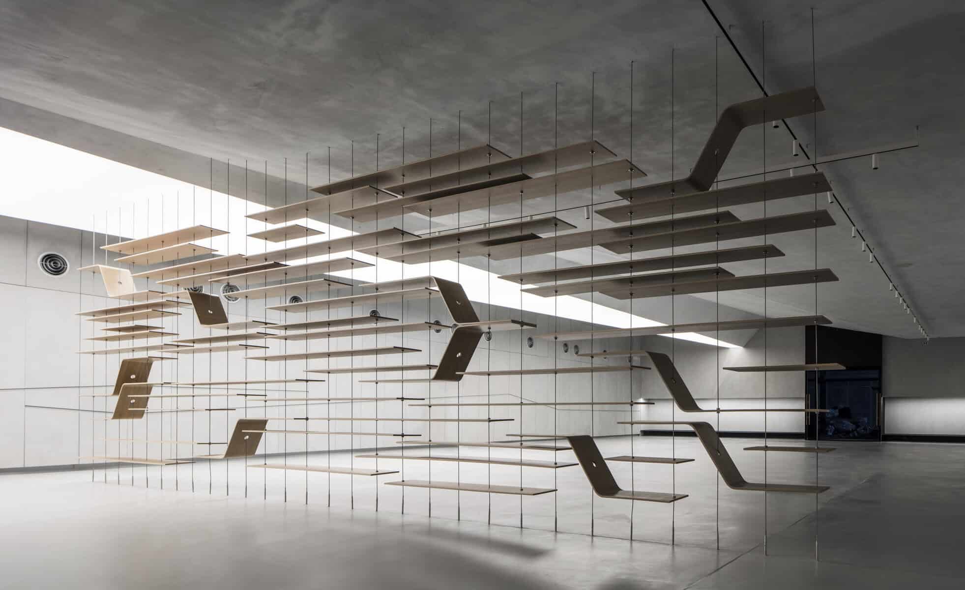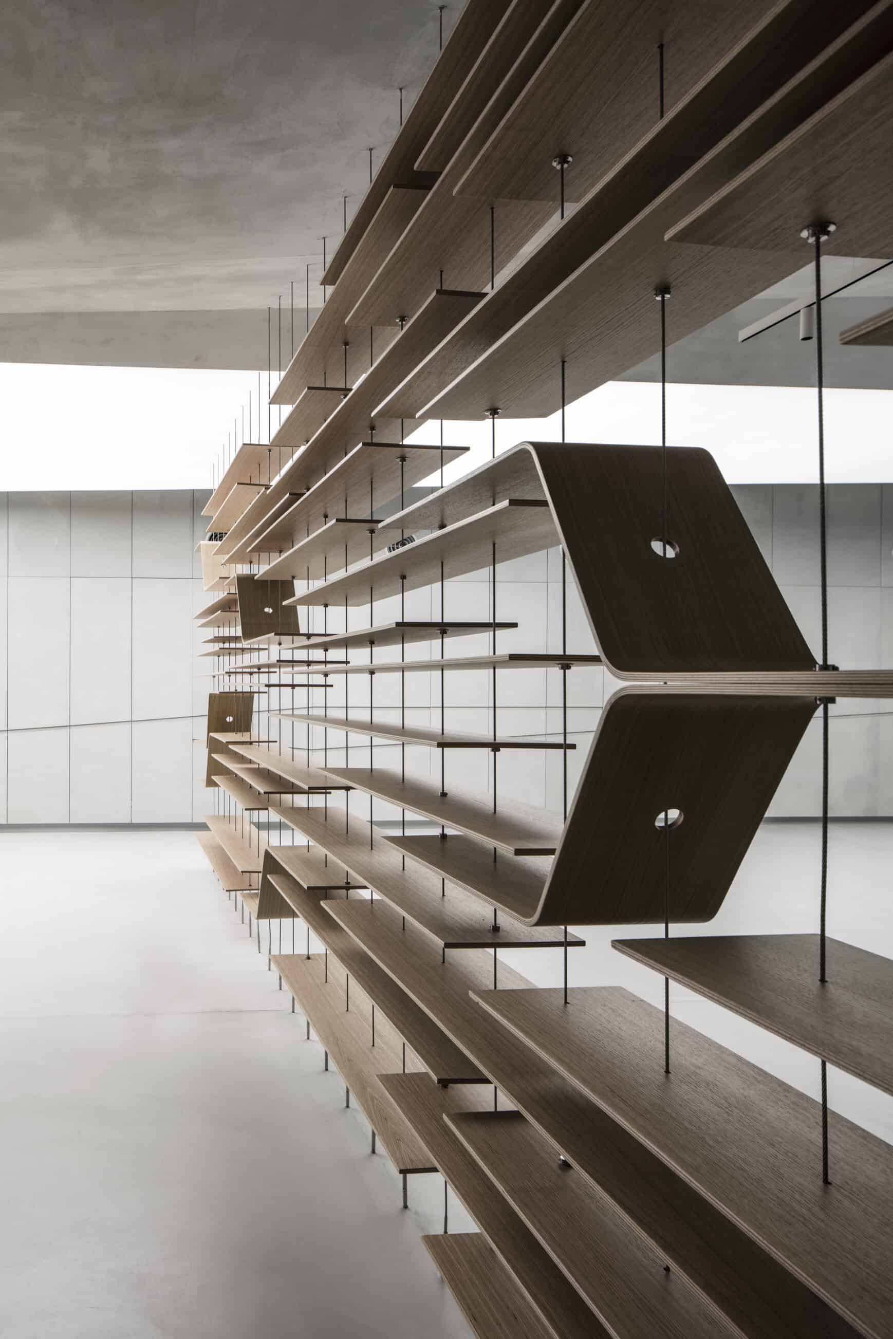 The other separating element designed for the space is a tribute to Pitaro’s tradition of plywood molding. A wood library hovering in space on stainless steel cables was designed to be made by Pitaro.  New molds were created to bend the wood shelves, and the installation was assembled on site by no other than the owner himself.