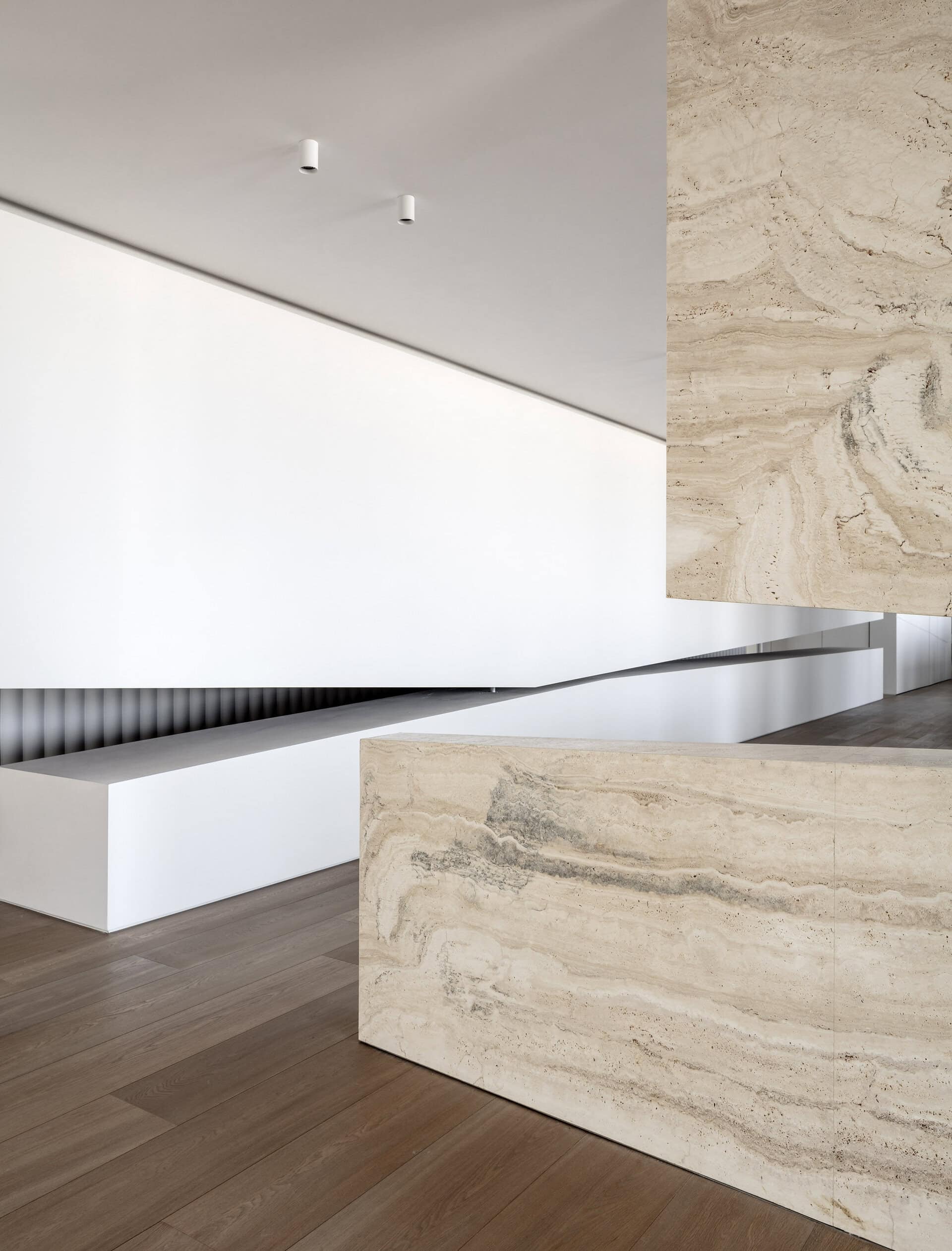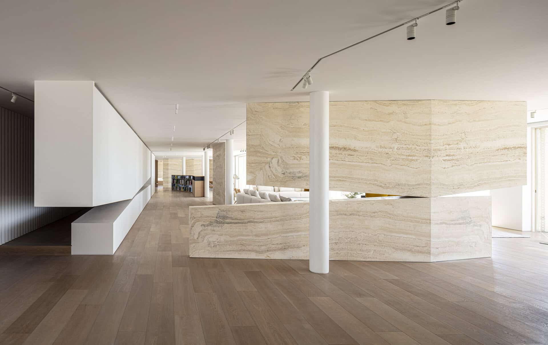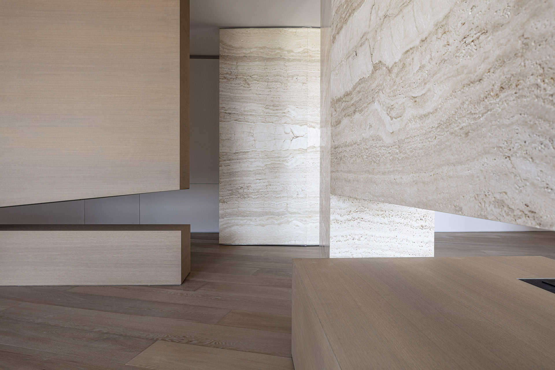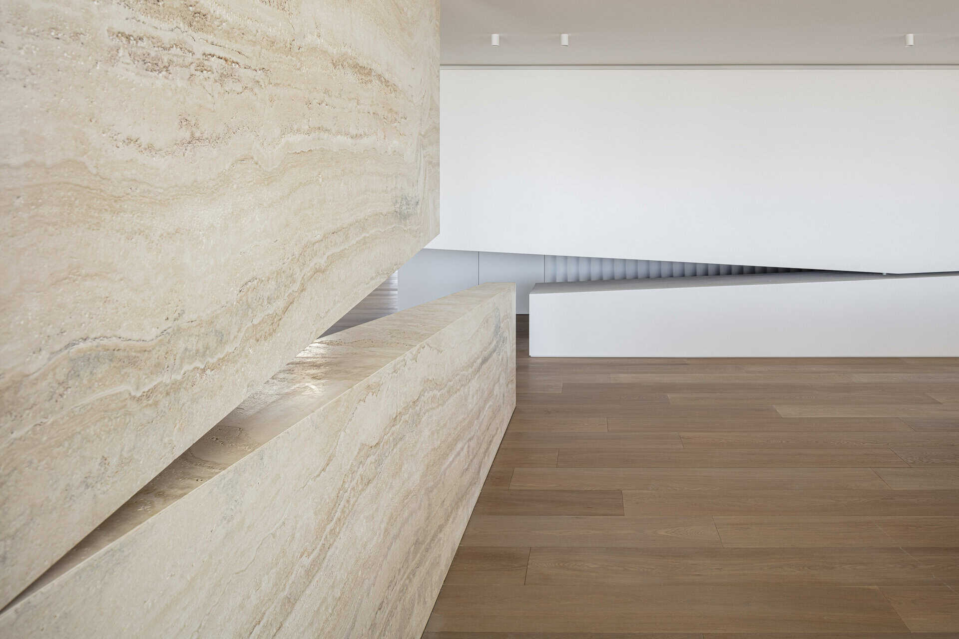 Stone sculptural partitions create separations between the different spaces. They are created as split masses, on the one hand divide and the other connect, allowing a framed glance of that which lies beyond.