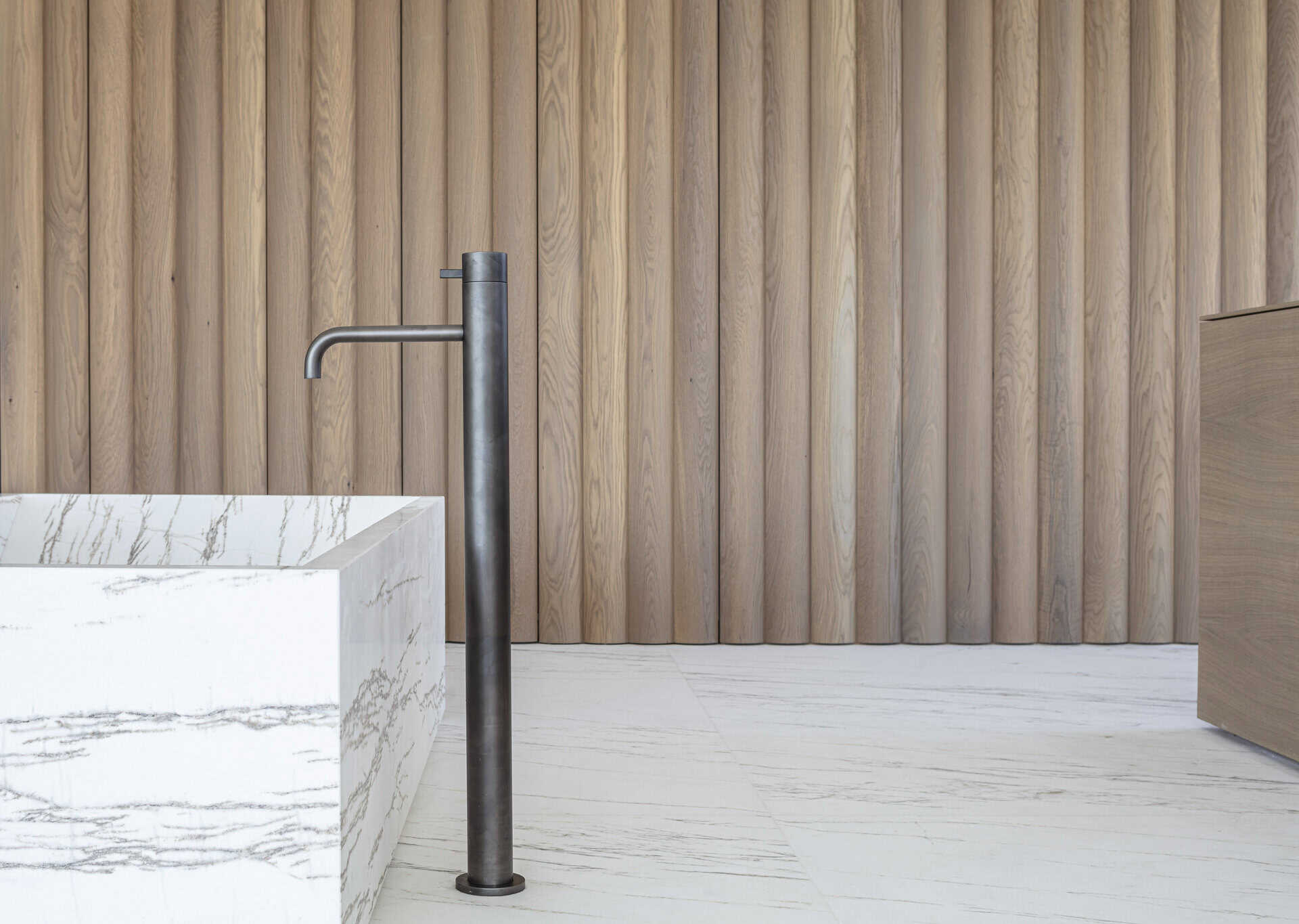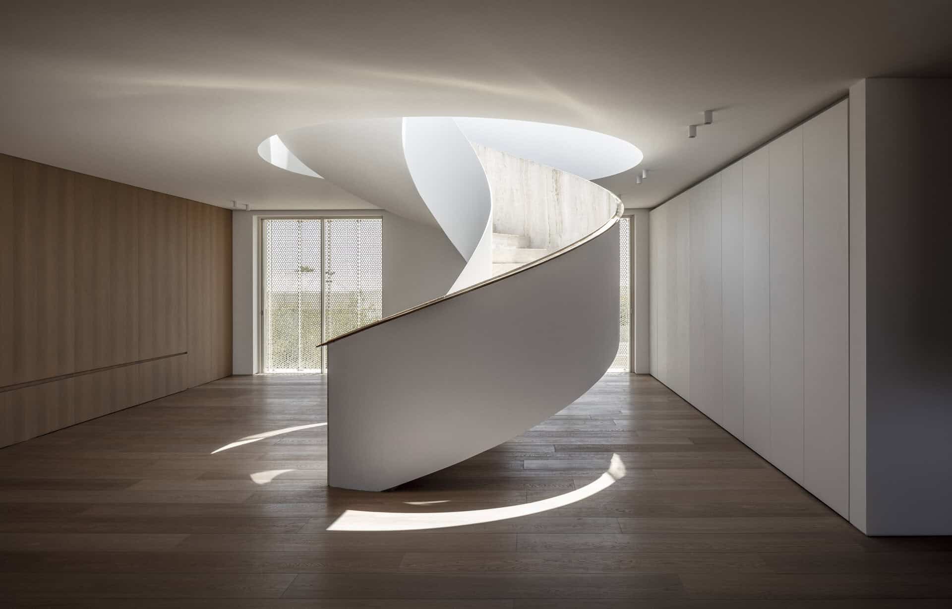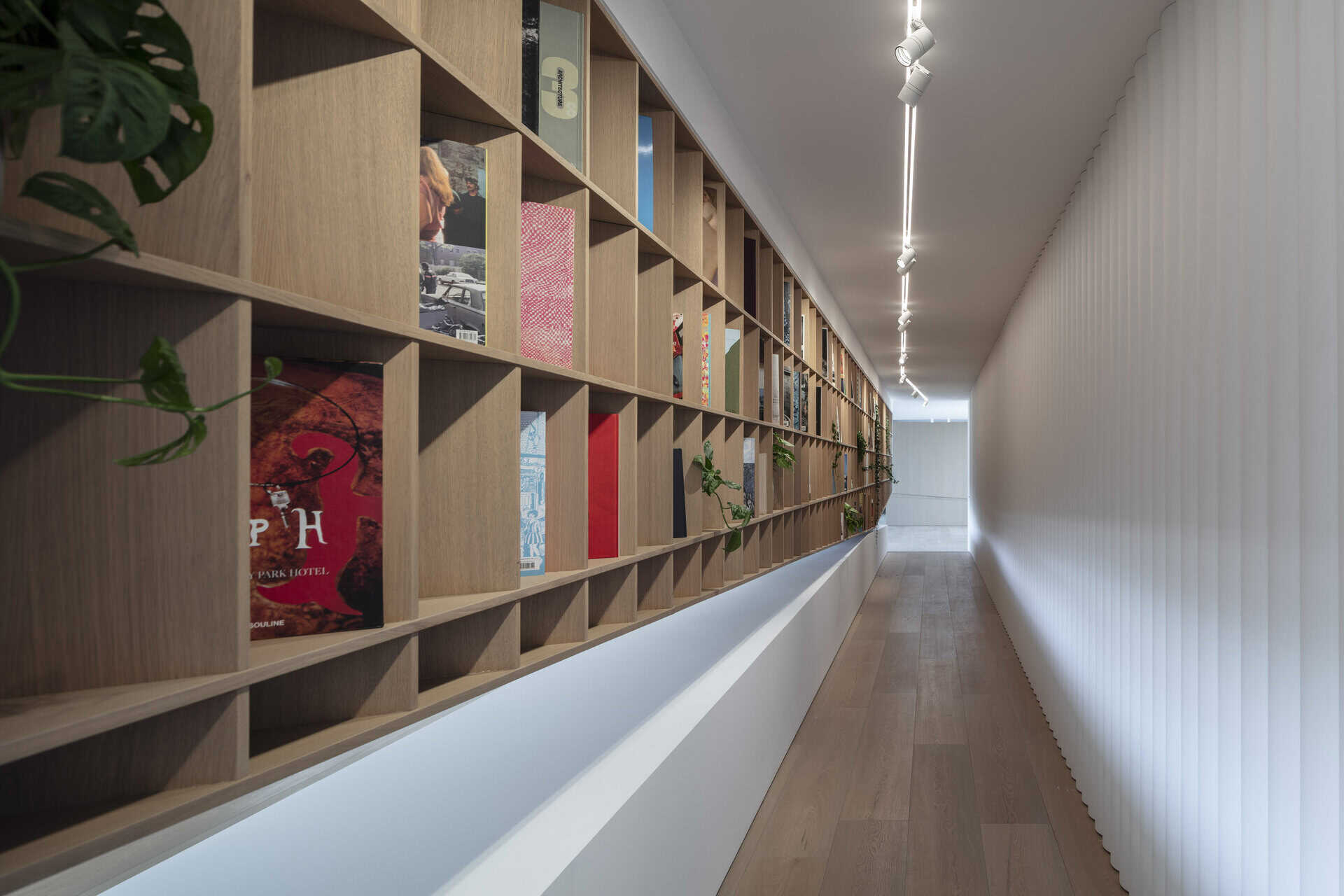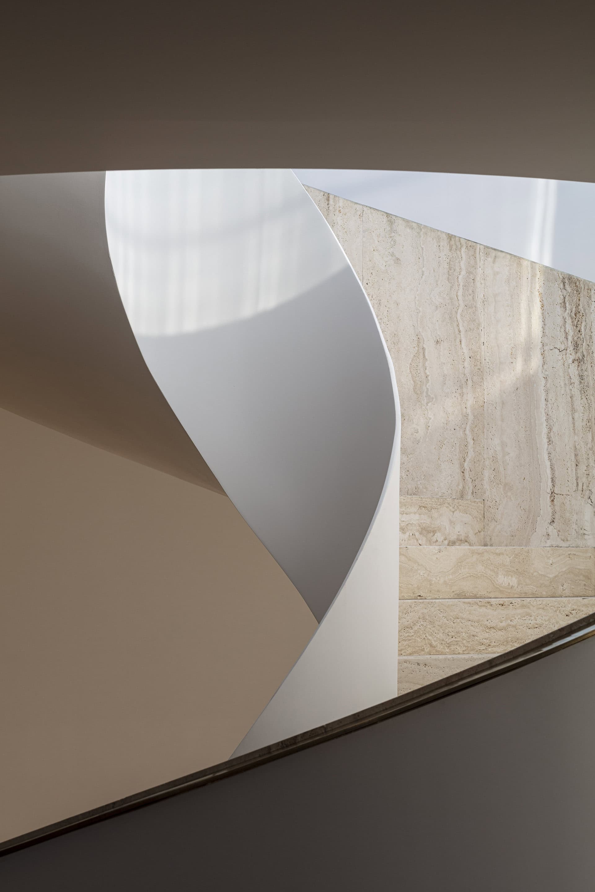 Stone sculptural partitions create separations between the different spaces. They are created as split masses, on the one hand divide and the other connect, allowing a framed glance of that which lies beyond.