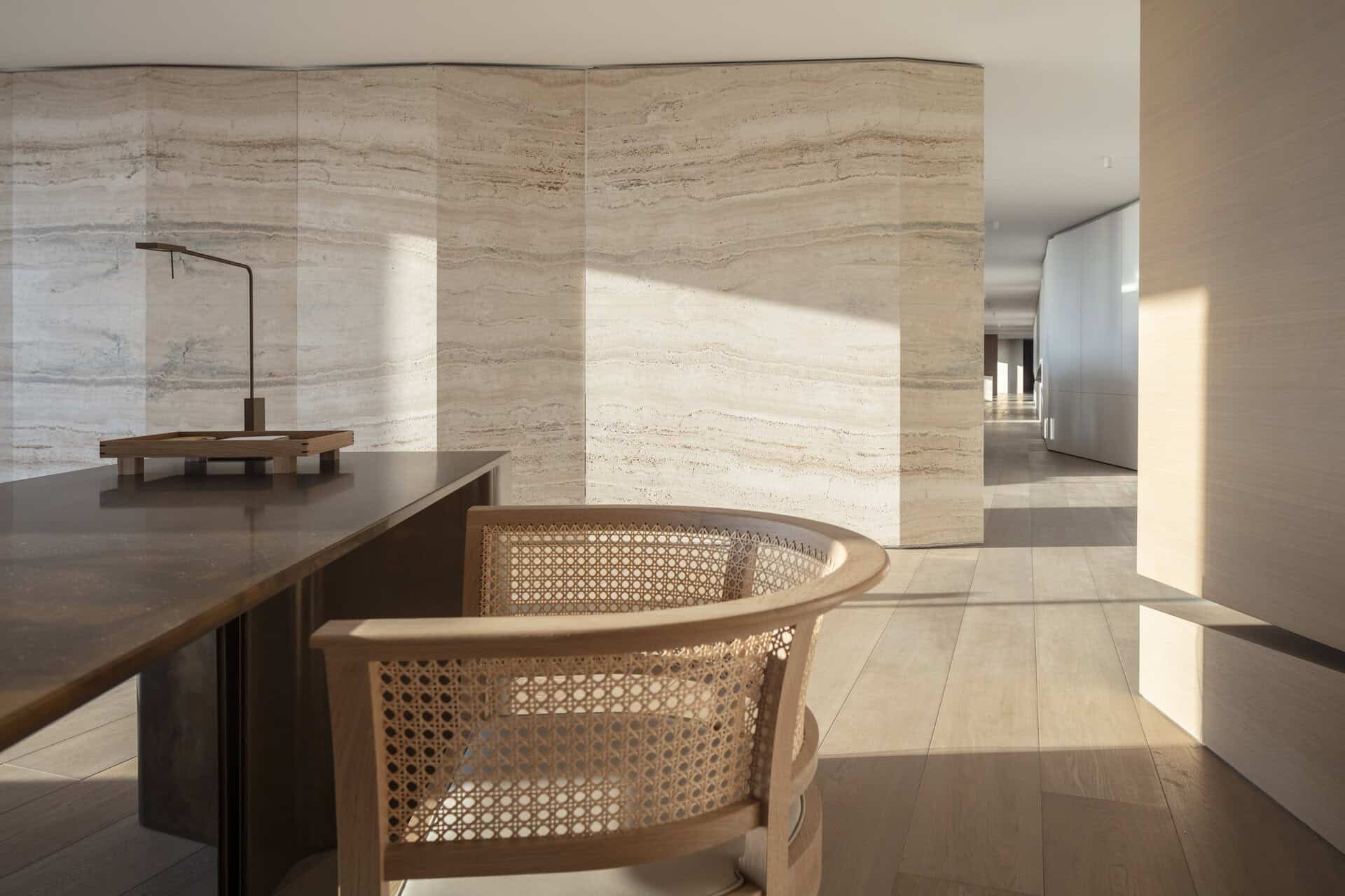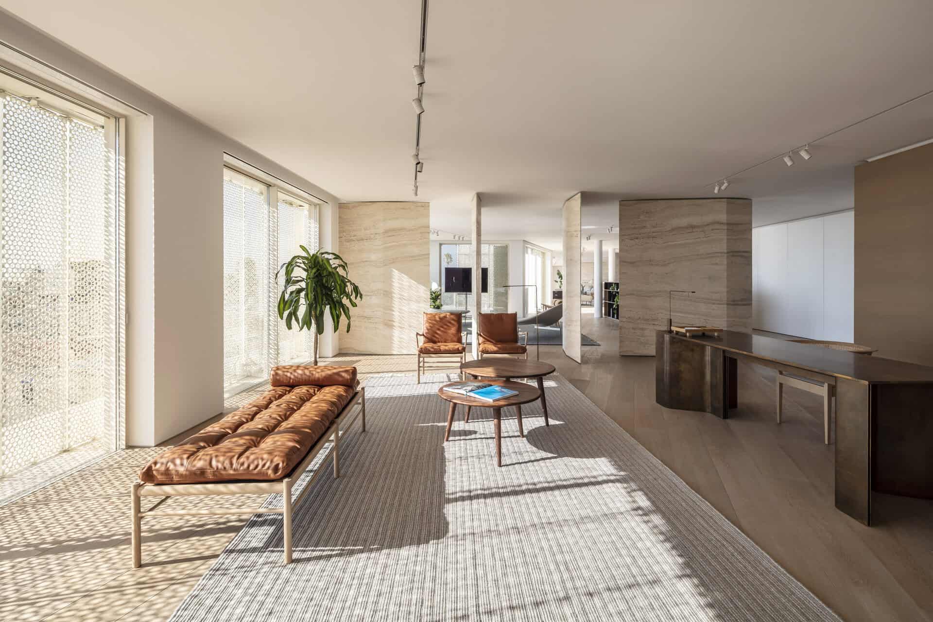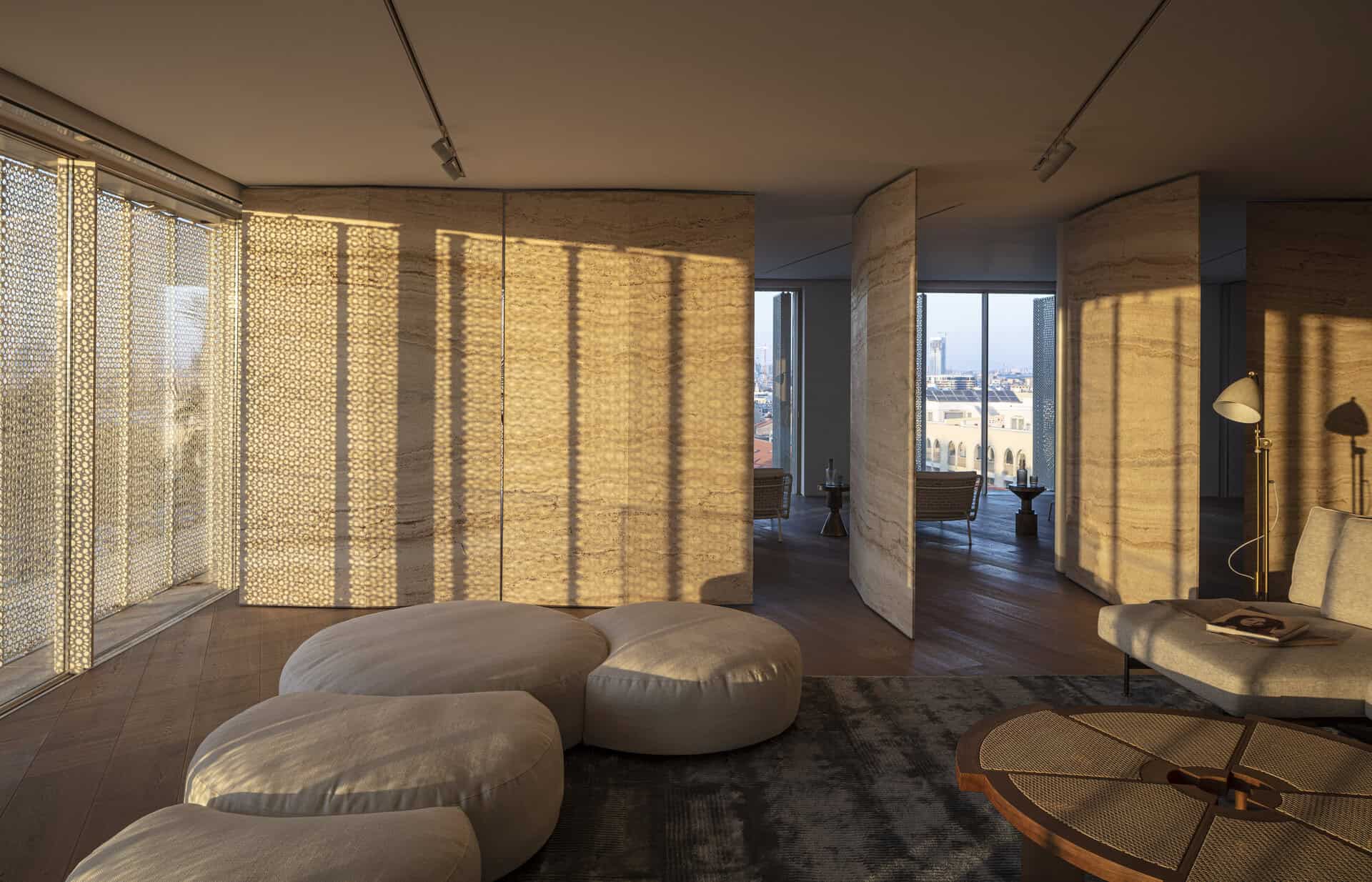 Bridging the old and the new is further accentuated through the selection of materials and finishes. Inspired by the warmth of Jaffa’s masonry structures, warm Mediterranean stones and marble were selected for the interior, combined with light wood floors to allow the brightness and beauty of the Israeli sun to flood the space graciously. These rich natural warm materials are complemented by rich fabrics and finishes.